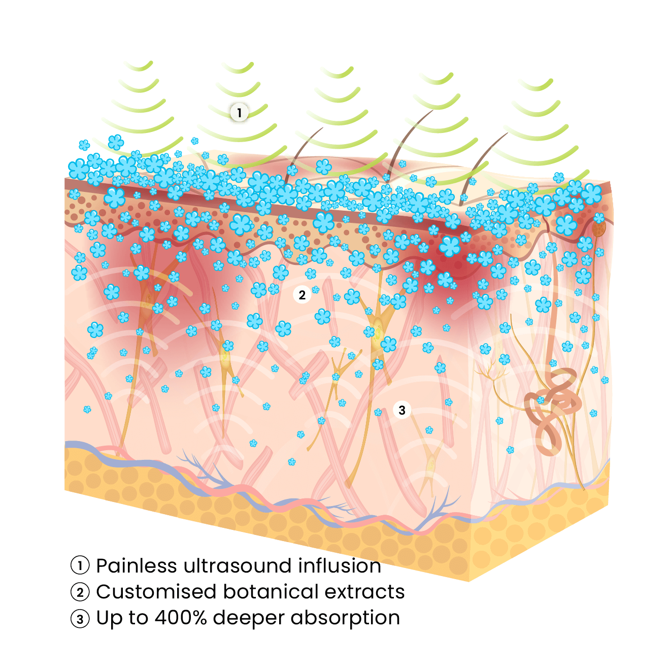 Our in-house researched ultrasound-assisted infusion method boosts uptake of barrier-restorative actives by up to 400%, enhancing delivery without pain, risk, or trigger to sensitive skins.