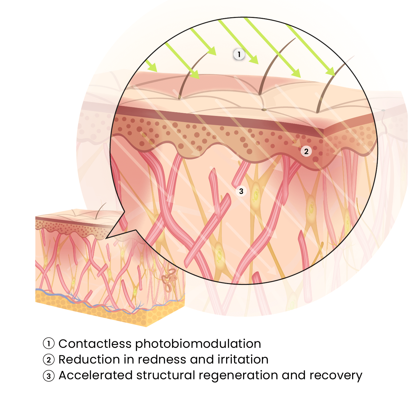 Clinically optimised light therapy reduces redness by up to 70% and supports vascular repair with patented wavelengths. It modulates inflammation and speeds recovery in sensitive or post-procedural skin.