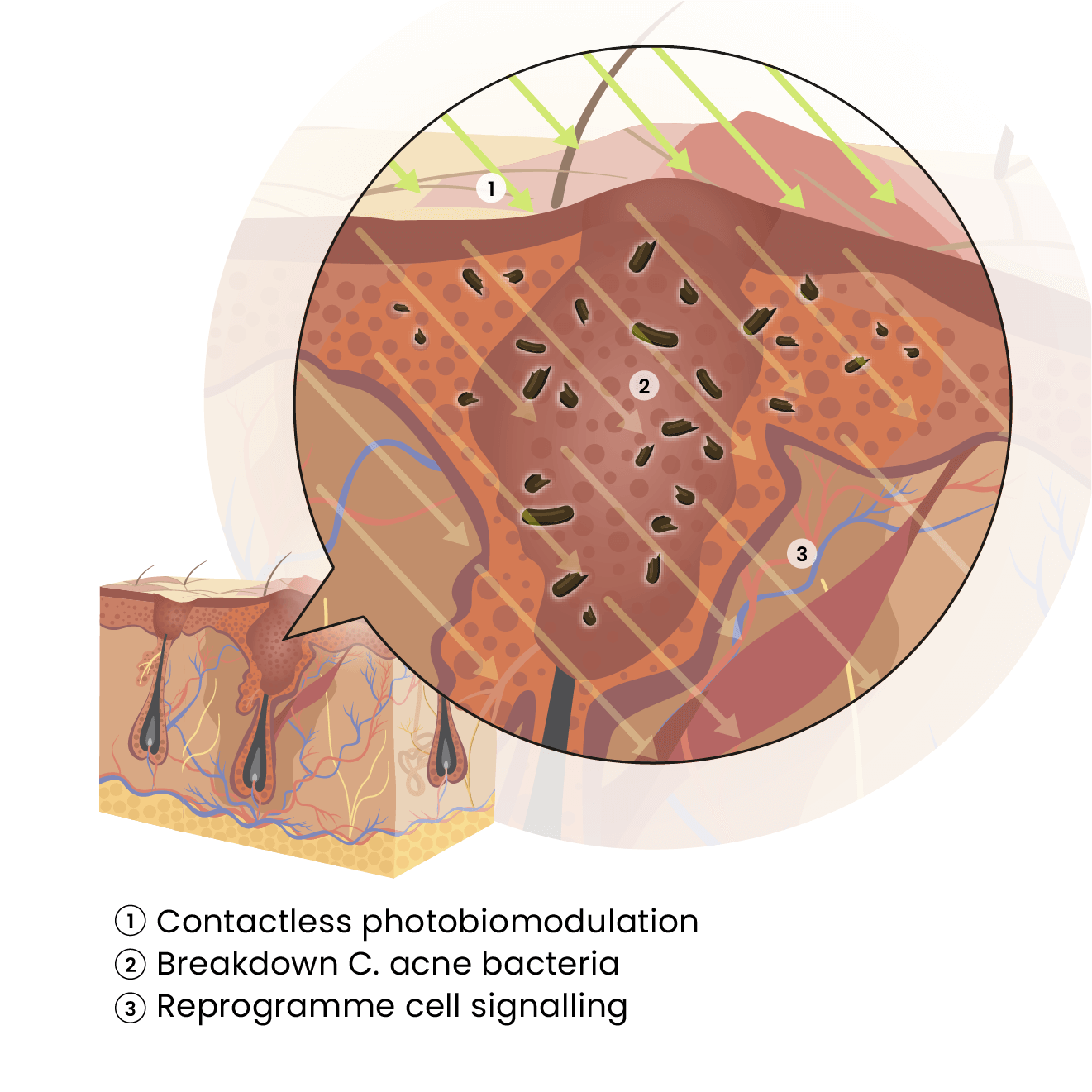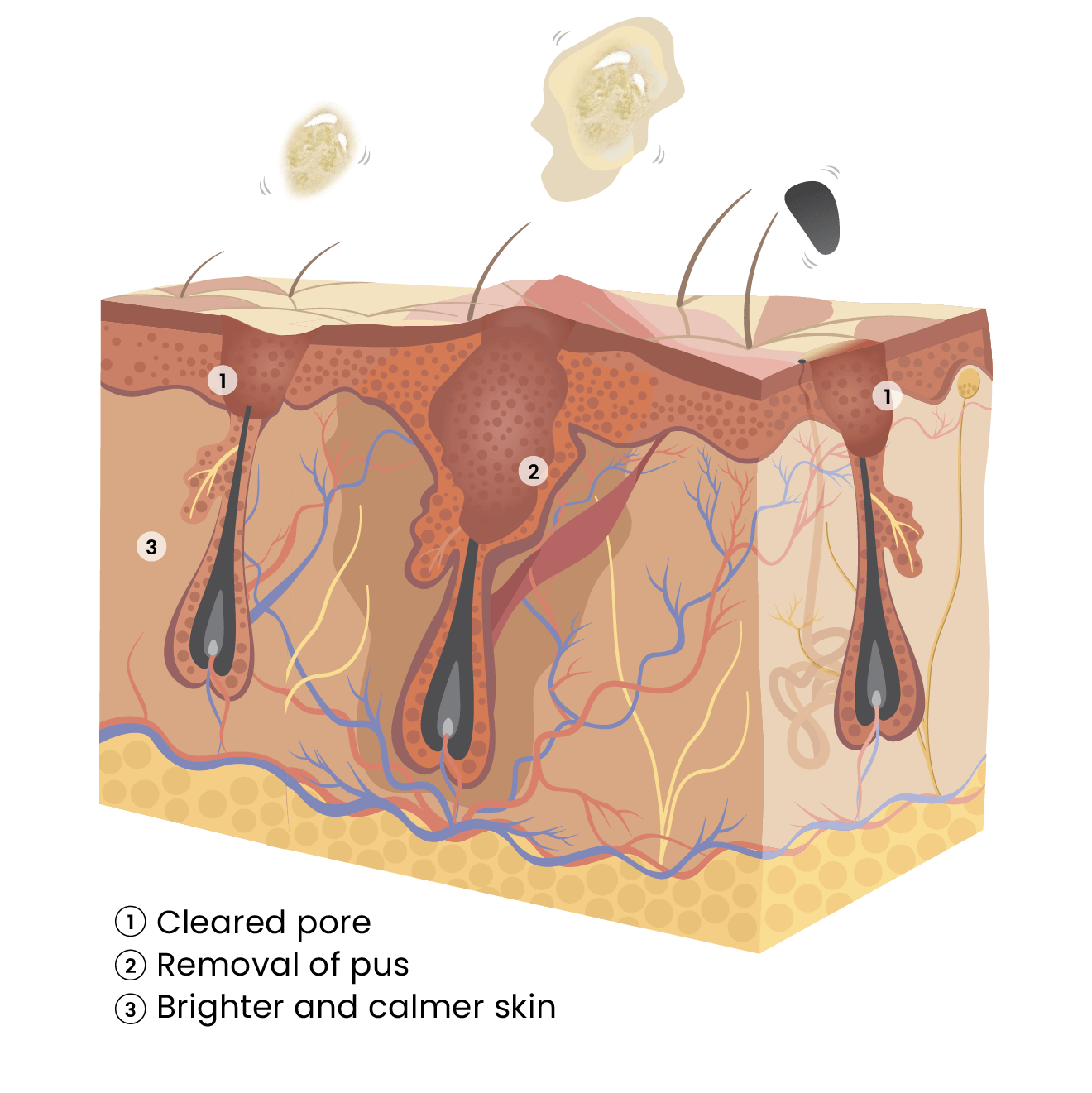 Reduced swelling, redness, pus, marks, and blemishes. Skin is calmer, clearer, smoother, and less reactive in 3 sessions.